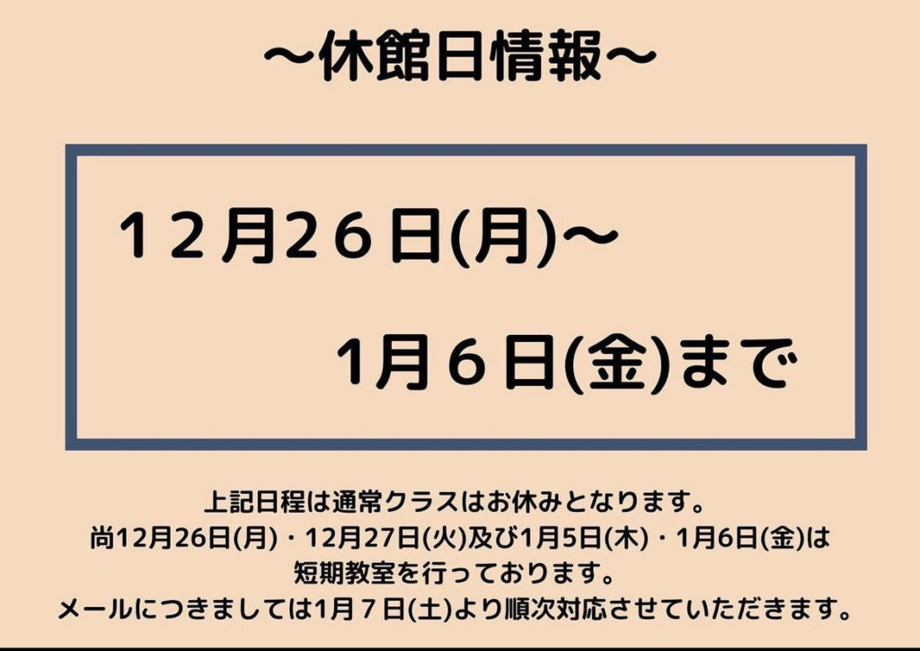 国分寺店、田無店ともに通常クラスは明日から年末年始のお休みに入ります。26日、27日と翌年1月5日、6日は短期教室となります。😊